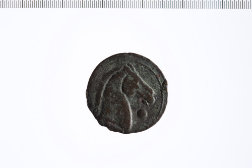 Dritto: Testa di Tanit a s. con corona e spiga di grano e collana semplice. Contorno lineare.. Rovescio: Testa di cavallo a d. e globetto.