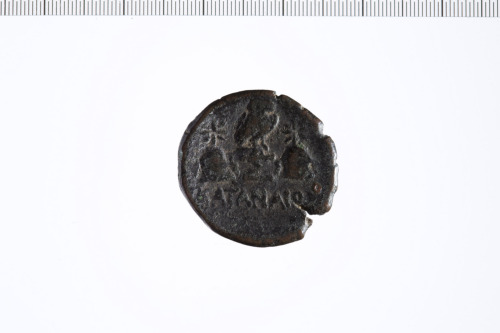 Dritto: Divinità fluviale stesa. Nella mano d. rython, anfora a s. sopra la spalla s. ramo.. Rovescio: Pilei dei Dioscuri sormontato da stelle. Tra le stelle gufo cìstante su monogramma.