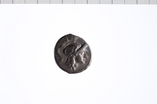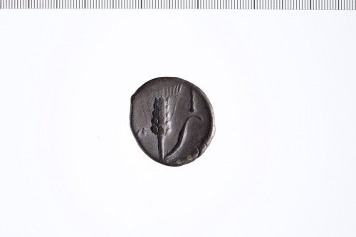 Dritto: Testa di Atena con elmo corinzio a d.. Rovescio: Spiga d'orzo; a s. monogramma; a d. clava