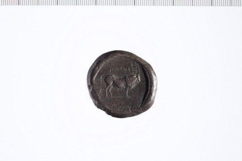 Dritto: Poseidone andante a s. lancia il tridente con la mano d.. Rovescio: Toro andante a d.