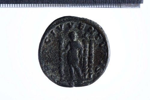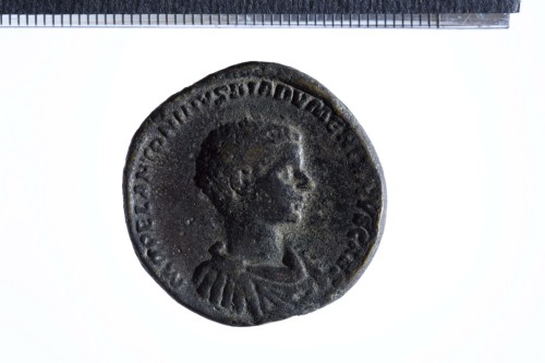 Dritto: Busto a testa nuda di Diadumeniano con corazza e paludamentum, di tre quarti in avanti; contorno perlinato.. Rovescio: Diadumeniano stante in posizione frontale, la testa volta a d., reggente scettro nella s. e stendardo nella d.; a d., due standardi; contorno perlinato.