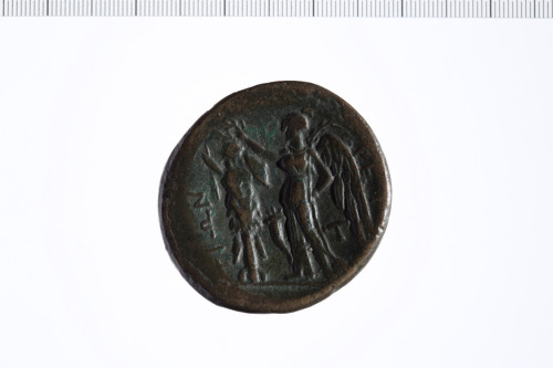 Dritto: Testa di Ares elmata a s. con dietro due globetti.. Rovescio: Nike con ramo di palma incorona un trofeo; in mezzo una cornucopia.