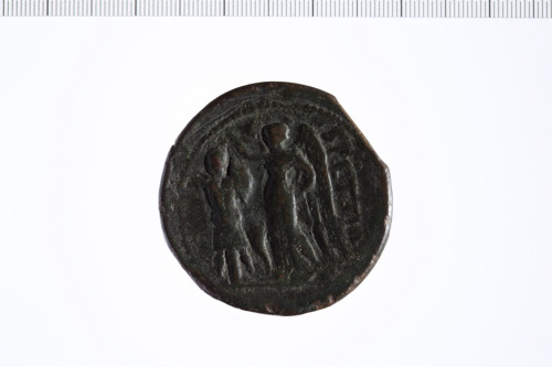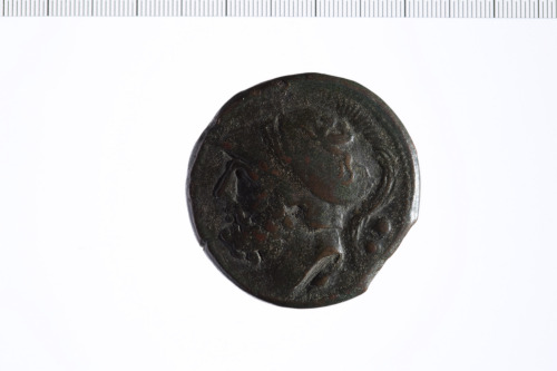 Dritto: Testa di Ares elmata a s. con dietro due globetti.. Rovescio: Nike con ramo di palma incorona un trofeo; in mezzo una cornucopia.
