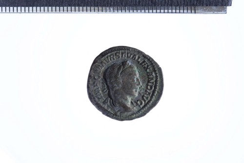 Dritto: Busto laureato di Alessandro Severo con paludamentum, di tre quarti di spalle; contorno perlinato.. Rovescio: Virtus stante a d. reggente spiedo capovolto nella d.; mano s.appoggiata a scudo; contorno perlinato.