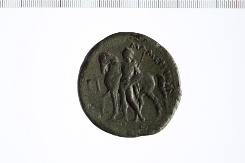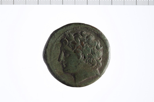Dritto: Testa laureata di Ares a s.. Rovescio: Guerriero stante con lancia in mano davanti a un cavallo stante a s.; in campo segno di valore P greco