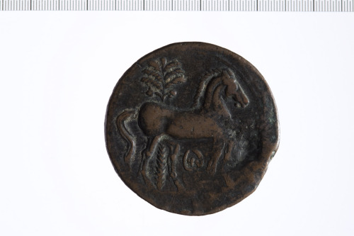 Dritto: Testa laureata di Tanit a s.. Rovescio: Cavallo stante a d. con dietro una palma.