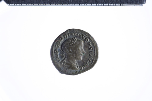 Dritto: Busto laureato di Gordiano III a d. con corazza e paludamentum, di tre quarti di spalle; contorno perlinato.. Rovescio: Gordiamo su cavallo avanzante a s., reggente spiedo nella s.; braccio d. proteso; contorno perlinato.