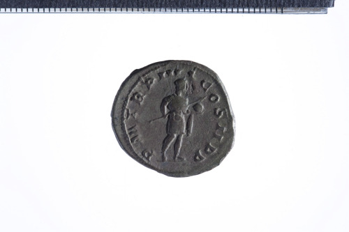 Dritto: Busto radiato di Gordiano III a d. con corazza e paludamentum, di tre quarti di spalle; contorno perlinato.. Rovescio: Gordiano in abiti militari, stante a d., reggente spiedo nella d. e globo nella s. protesa; contorno perlinato.
