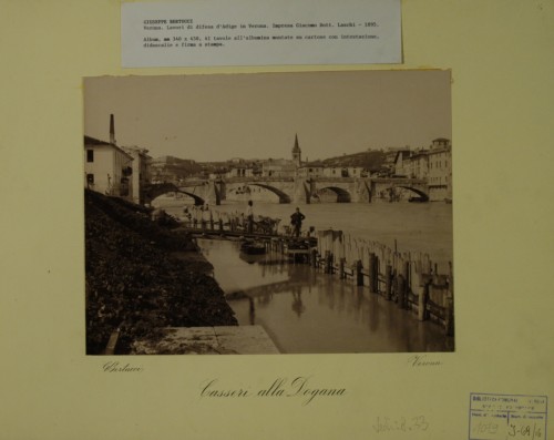 - NOTIZIE STORICO CRITICHE I lavori documentati in questa stampa fotografica sono parte del progetto di massima concernente l'assestamento dell'alveo urbano d'Adige di Verona, redatto dalla Commissione Governativa Municipale, diretta dall'ingegner Capo Municipale Emilio Cavalieri. Il progetto fu approvato dal Consiglio Comunale in data 11 settembre 1885, secondo le modifiche redatte al progetto dall'ingegner Capo Municipale Tullio Donatelli; fu riapprovato con delibera dal Consiglio Comunale in data 25 ottobre 1889 e dal Ministero dei Lavori Pubblici con un'ordinanza pervenuta al Comune di Verona il 3 aprile 1890. Il tratto d'alveo d'Adige documentato riguarda la sezione del progetto denominata "Tronco II". I lavori furono realizzati dall'impresa costruttrice Giacomo dott. Laschi tra il 4 febbraio 1890 e il 31 marzo 1894.