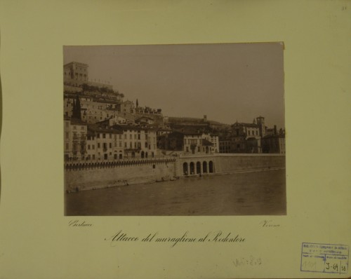 - NOTIZIE STORICO CRITICHE La sistemazione del tronco urbano d'Adige documentato in questa stampa fotografica prevedeva la costruzione di due muraglioni continui, uno di riva destra da Castelvecchio al Bastione S. Francesco, e uno di riva sinistra dal ponte Pietra alla presa Giuliari. I lavori furono completati dalla ditta Laschi il 31 marzo del 1894.