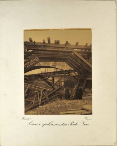 - NOTIZIE STORICO CRITICHE I lavori rappresentati in questa stampa sono una parte di quelli compresi nel progetto di massima redatto, per la sistemazione dell'alveo urbano dell'Adige in Verona, dalla Commissione Governativa Municipale diretta dall'ingegnere Capo Municipale Emilio Cavalieri. Approvato dal Consiglio Comunale in data 11 settembre 1885, secondo la modifica al progetto redatta dall'ingegnere Capo Municipale Tullio Donatelli, approvato con delibera del Cosiglio Comunale in data 24 aprile 1889, e dal Ministero dei Lavori Pubblici pervenuta al Comune il 31 agosto 1889. Il tratto rappresentato è riferibile alla parte del progetto denominato tronco IV. I lavori si svolsero dal 4 febbraio 1890 al 31 marzo 1894 dall'impresa costruttrice Giacomo dott. Laschi vincitrice dell'appalto.