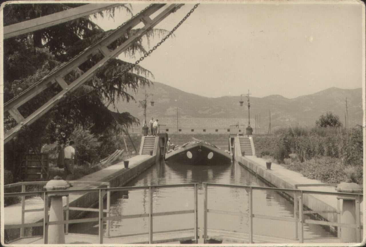 Il burcio Maria II mentre sta entrando nel bacino della conca di navigazione di Battaglia Terme.
