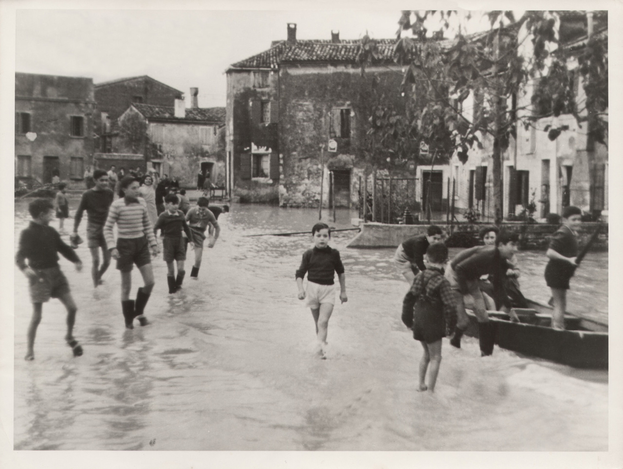 Ragazzi che giocano in Piazza Ortazzo a Battaglia Terme durante l'alluvione del 7 luglio 1956 .