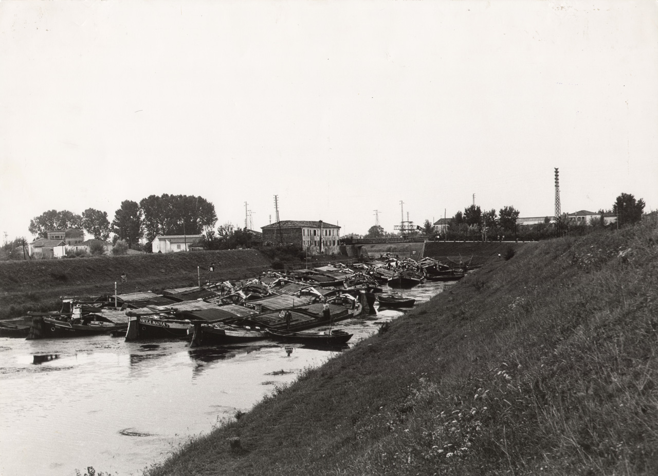 Battaglia Terme, anni '50. Mandracio inferiore; flottiglia di barche in attesa della butà per partire verso Chioggia.