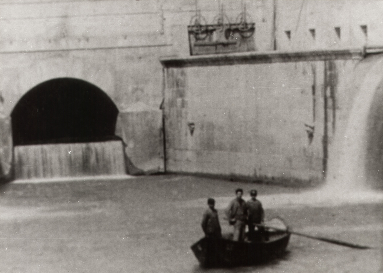Piccolo battello sotto la cascata dell'Arco di mezzo a Battaglia Terme.
