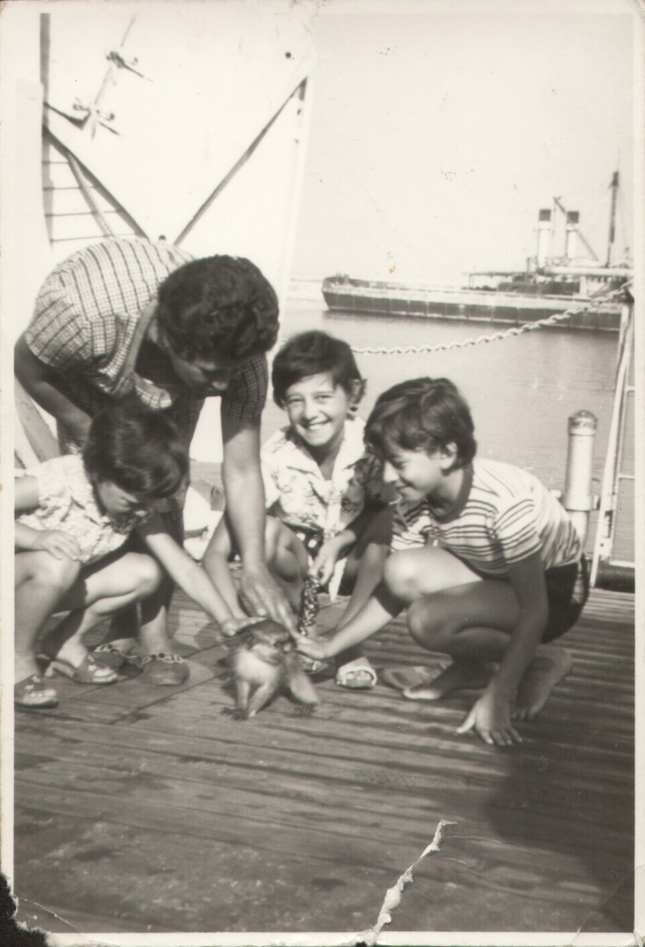 Foto ricordo delle figlie del barcaro Silvestro Fusaro al Tronchetto a Venezia.