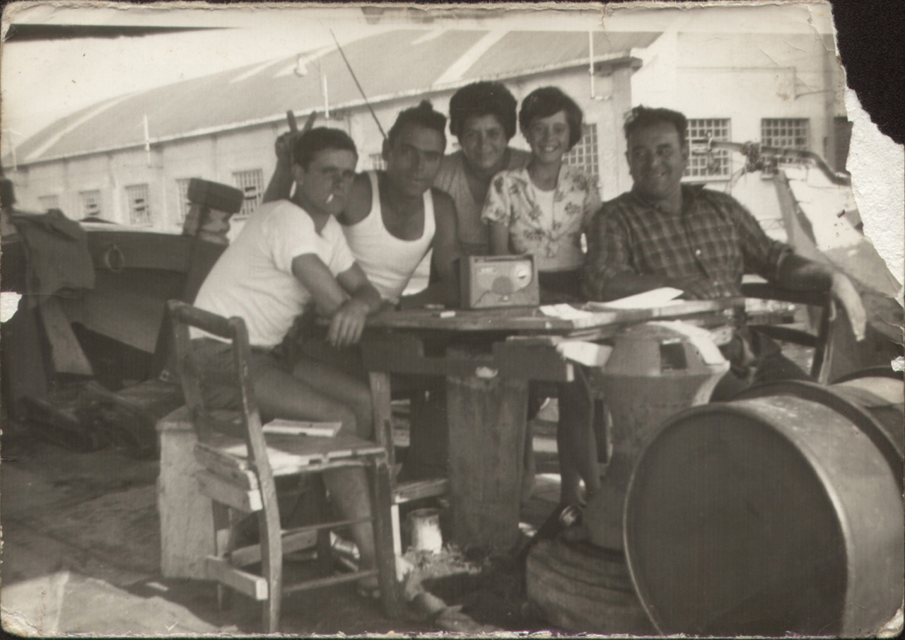Foto ricordo della famiglia del barcaro Silvetro Fusaro sotto il tendalino del suo burcio Sergio.