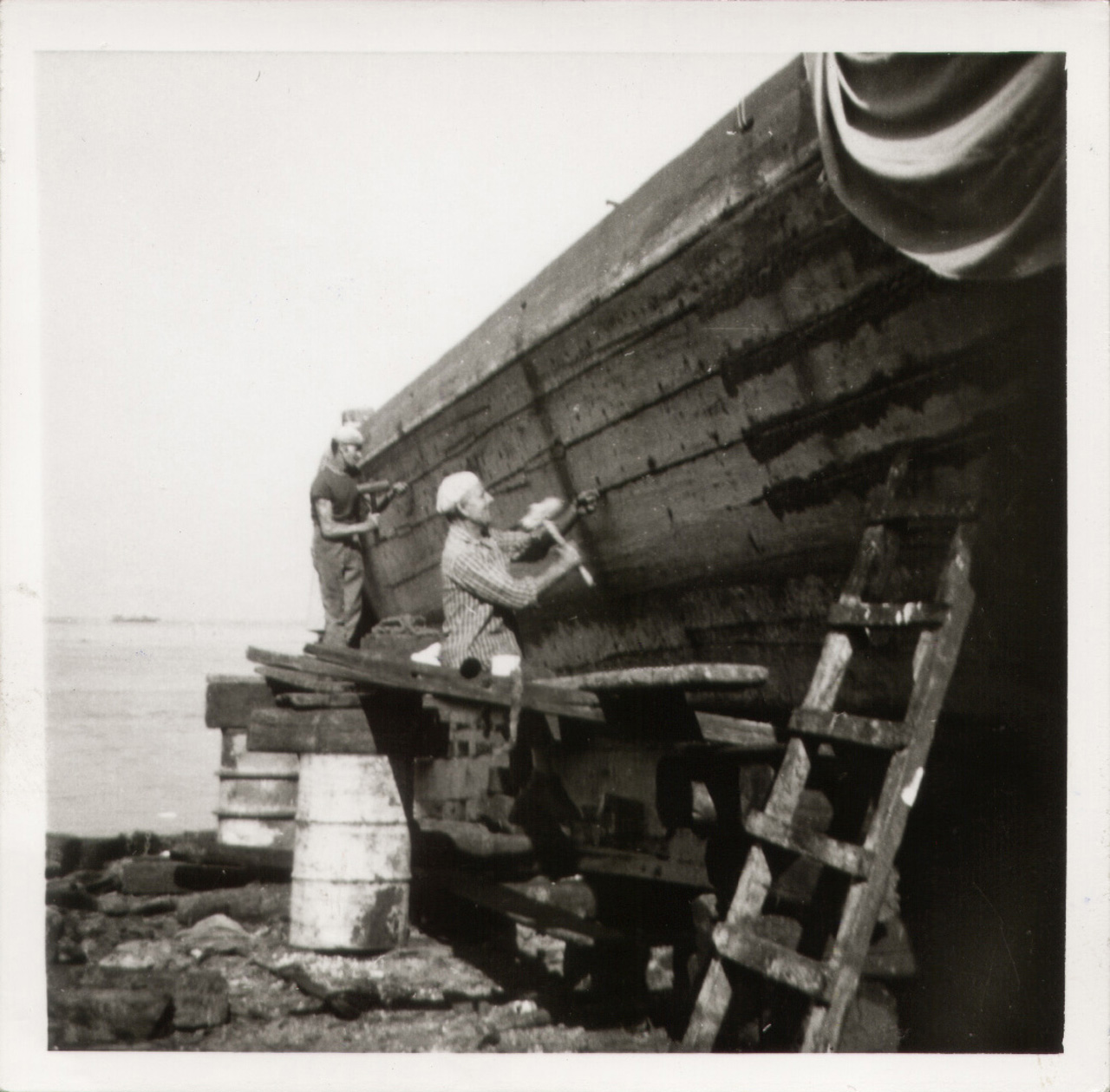 Operazione di calafataggio presso il cantiere di San Pietro in Volta.