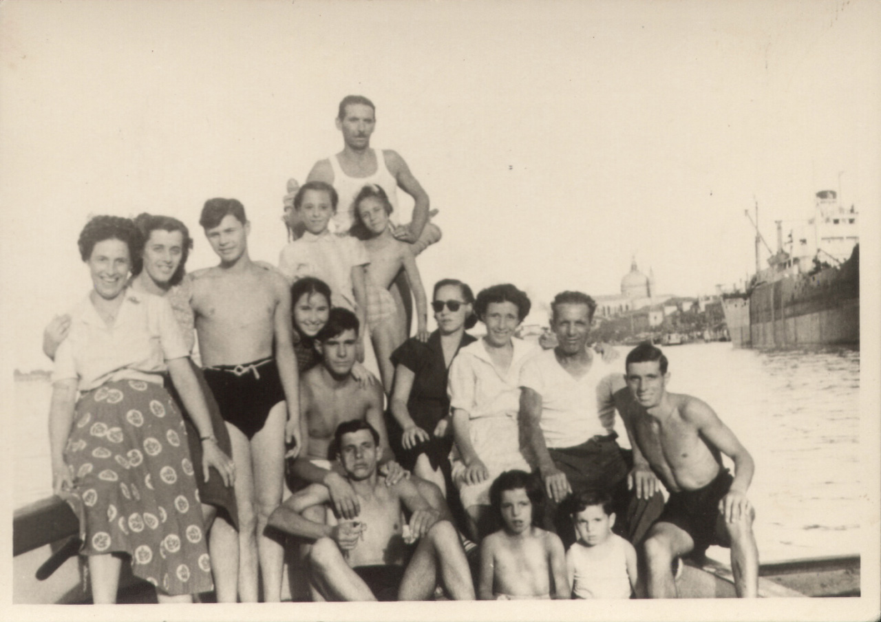 Foto ricordo della famiglia Cappellozza a bordo del suo burcio nel canale della Giudecca a Venezia.
