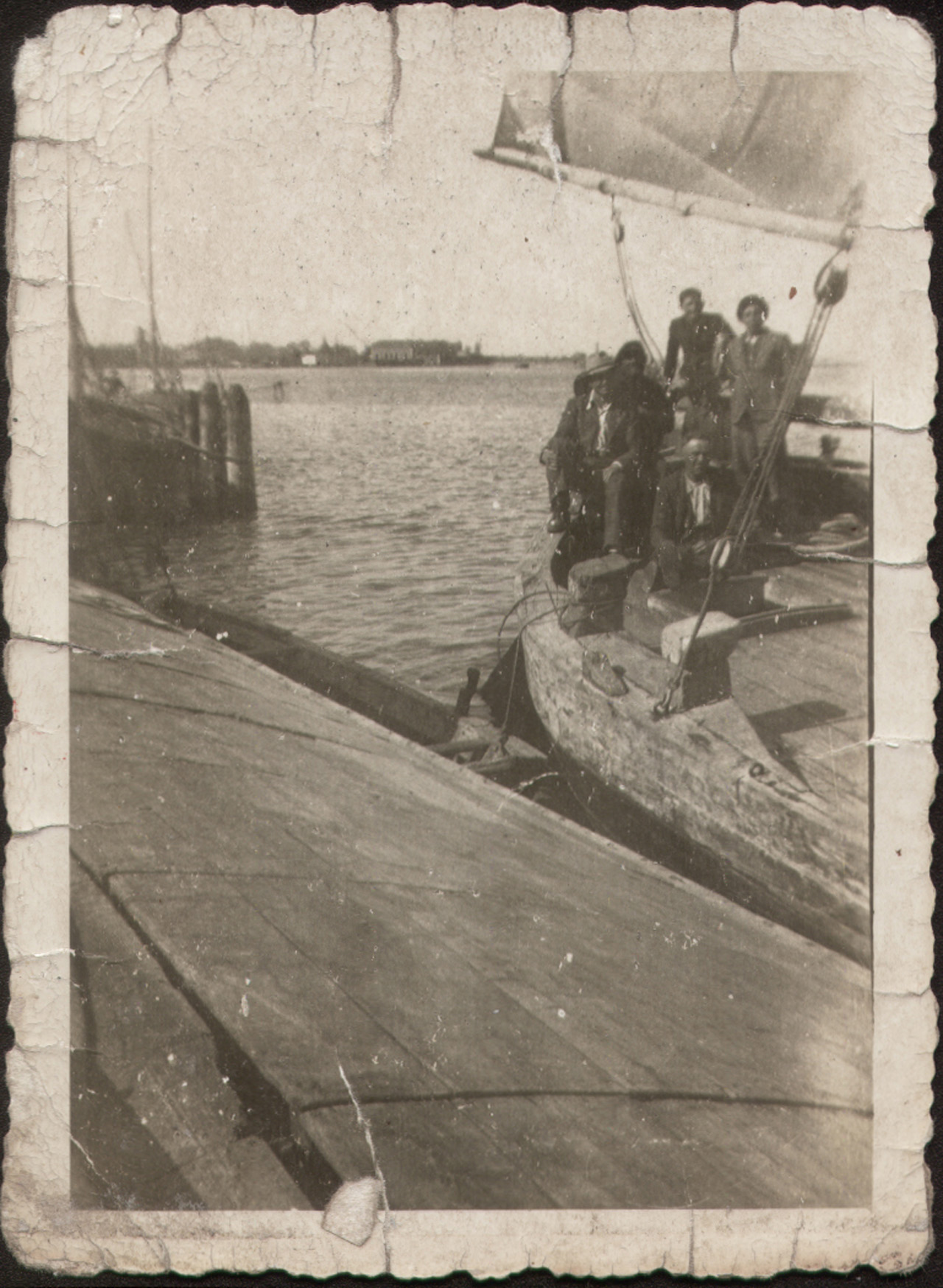 Foto ricordo di un gruppo di barcari di Treviso a bordo di un burcio ormeggiato nella laguna di Mazzorbo.