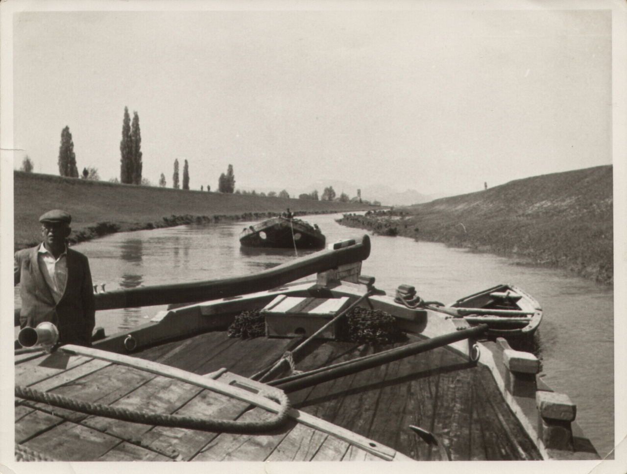Canale Vigenzone tra Gorgo e Bovolenta, anni '50. Il barcaro Leonida Cappellozza al timone mentre, in viaggio verso Chioggia, con la barca traina un'altra imbarcazione.