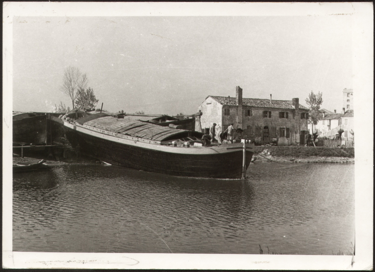 Loreo, Cantiere dei F.lli Doni, anni '50. Varo di poppa, come normalmente avviene, di un grosso burcio.