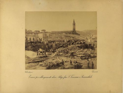 - NOTIZIE STORICO CRITICHE I lavori rappresentati in questa stampa sono una parte di quelli compresi nel progetto di massima redatto, per la sistemazione dell'alveo urbano dell'Adige in Verona, dalla Commissione Governativa Municipale diretta dall'ingegnere Capo Municipale Emilio Cavalieri. Approvato dal Consiglio Comunale in data 11 settembre 1885, secondo la modifica al progetto redatta dall'ingegnere Capo Municipale Tullio Donatelli, approvato con delibera del Cosiglio Comunale in data 24 aprile 1889, e dal Ministero dei Lavori Pubblici pervenuta al Comune il 31 agosto 1889. Il tratto rappresentato è riferibile alla parte del progetto denominato tronco IV. I lavori si svolsero dal 4 febbraio 1890 al 31 marzo 1894 dall'impresa costruttrice Giacomo dott. Laschi vincitrice dell'appalto.