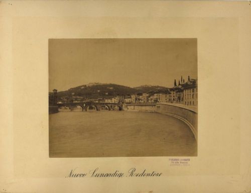 - NOTIZIE STORICO CRITICHE Il tratto del tronco urbano d'Adige rappresentato in questa stampa era compreso nel progetto di sistemazione dell'alveo urbano denominati tronco II e IV. Il progetto prevedeva la costruzione di due muraglioni continui,uno di riva destra, da Castelvecchio al Bastione S. Francesco, e uno di riva sinistra, dal ponte Pietra alla presa Giuliari. I lavori furono completati e consegnati dalla ditta Laschi il 31 marzo del 1894.