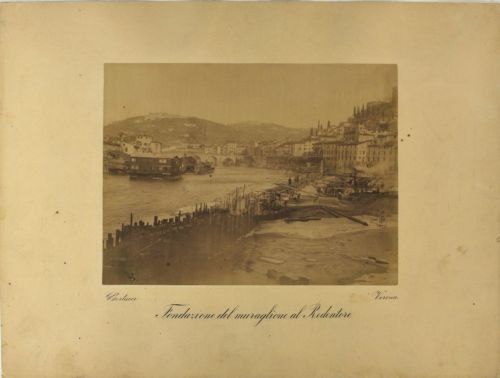 - NOTIZIE STORICO CRITICHE I lavori rappresentati in questa stampa sono una parte di quelli compresi nel progetto di massima redatto, per la sistemazione dell'alveo urbano dell'Adige in Verona, dalla Commissione Governativa Municipale diretta dall'ingegnere Capo Municipale Emilio Cavalieri. Approvato dal Consiglio Comunale in data 11 settembre 1885, secondo la modifica al progetto redatta dall'ingegnere Capo Municipale Tullio Donatelli, approvato con delibera del Consiglio Comunale in data 24 aprile 1889, e dal Ministero dei Lavori Pubblici pervenuta al Comune il 31 agosto 1889. Il tratto rappresentato è riferibile alla parte del progetto denominato tronco IV. I lavori si svolsero dal 4 febbraio 1890 al 31 marzo 1894 dall'impresa costruttrice Giacomo dott. Laschi vincitrice dell'appalto.
