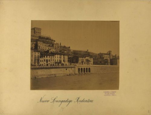 - NOTIZIE STORICO CRITICHE Il tratto del tronco urbano d'Adige rappresentato in questa stampa era compreso nel progetto di sistemazione dell'alveo urbano denominati tronco II e IV. Il progetto prevedeva la costruzione di due muraglioni continui,uno di riva destra, da Castelvecchio al Bastione S. Francesco, e uno di riva sinistra, dal ponte Pietra alla presa Giuliari. I lavori furono completati e consegnati dalla ditta Laschi il 31 marzo del 1894.