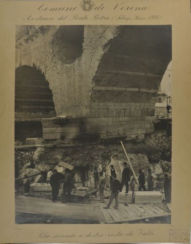 - NOTIZIE STORICO CRITICHE I lavori rappresentati in questa stampa sono una parte di quelli compresi nel progetto di massima redatto, per la sistemazione dell'alveo urbano dell'Adige in Verona, dalla Commissione Governativa Municipale diretta dall'ingegnere Capo Municipale Emilio Cavalieri. Approvato dal Consiglio Comunale in data 11 settembre 1885, secondo la modifica al progetto redatta dall'ingegnere Capo Municipale Tullio Donatelli, approvato con delibera del Consiglio Comunale in data 25 ottobre 1889, e dal Ministero dei Lavori Pubblici pervenuta al Comune il 3 aprile 1890. Il tratto rappresentato è riferibile alla parte del progetto denominato tronco II. I lavori si svolsero dal 4 febbraio 1890 al 31 marzo 1894 a cura dell'impresa costruttrice Giacomo dott. Laschi vincitrice dell'appalto.