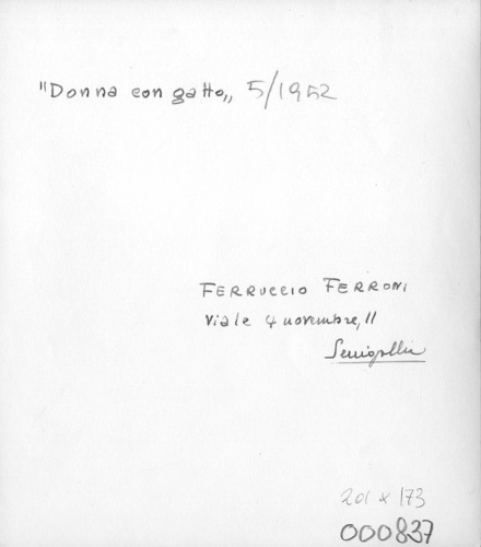 - ISCRIZIONI sul supporto primario: verso: in alto a sinistra - "Donna con gatto" - a matita -