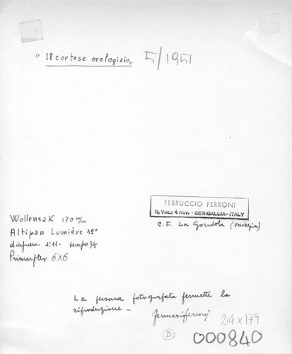 - ISCRIZIONI sul supporto primario: verso: in alto a sinistra - "Il cortese orologiaio" - a matita -