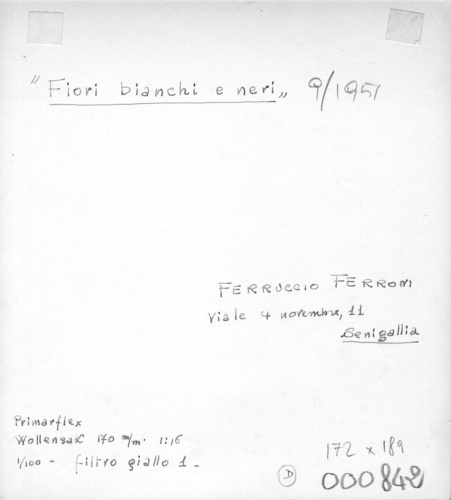 - ISCRIZIONI sul supporto primario: verso: in alto a sinistra - "Fiori bianchi e neri" - a matita -