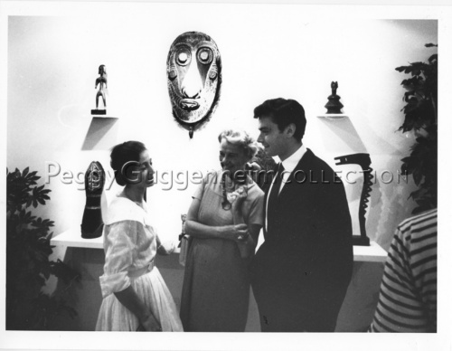 Painter Matelda Capisani, Peggy Guggenheim, Paolo Barozzi (left to right) at the opening of the exhibition "Black Primitive Art" organized by Barozzi; Venice, early 1960s.