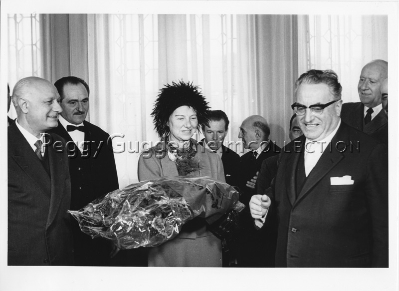 Peggy Guggenheim in Municipio a Venezia con il sindaco Giovanni Favaretto Fisca (alla sua destra), il giorno in cui le viene conferita la cittadinanza onoraria, 5 febbraio 1962.