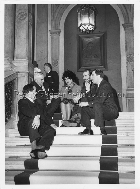 Giuseppe Marchiori, Giovanni Comisso, Peggy Guggenheim, Emilio Vedova e Giuseppe Santomaso (da sinistra a destra) sullo scalone del Municipio di Venezia il giorno in cui viene conferita a Peggy la cittadinanza onoraria, 5 febbraio 1962.