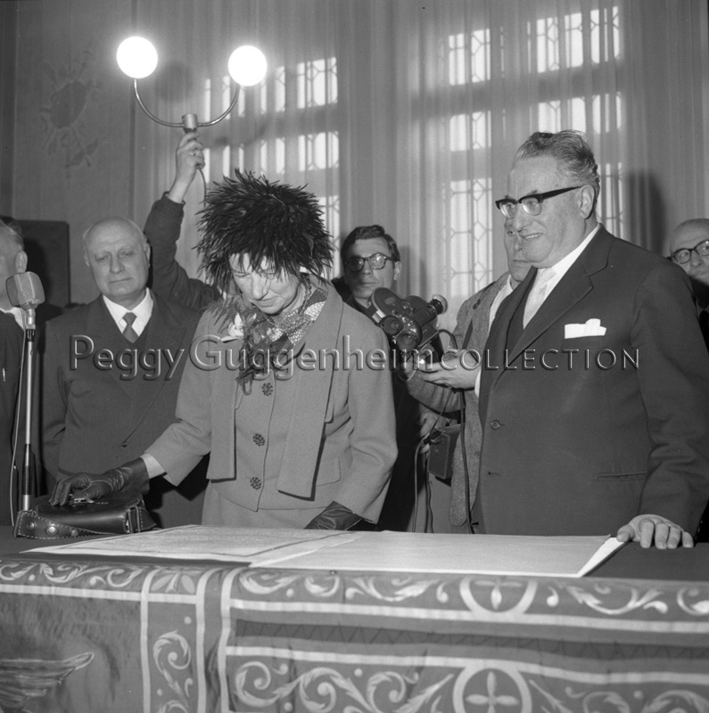 Peggy Guggenheim at the Venice City Hall with mayor Giovanni Favaretto Fisca (to her right), on the day she was awarded the honorary citizenship, 5 February 1962.