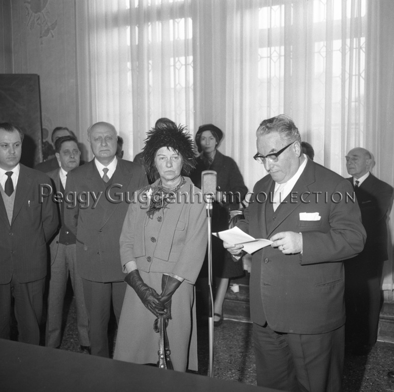 Peggy Guggenheim at the Venice City Hall with mayor Giovanni Favaretto Fisca (to her right), on the day she was awarded the honorary citizenship, 5 February 1962.