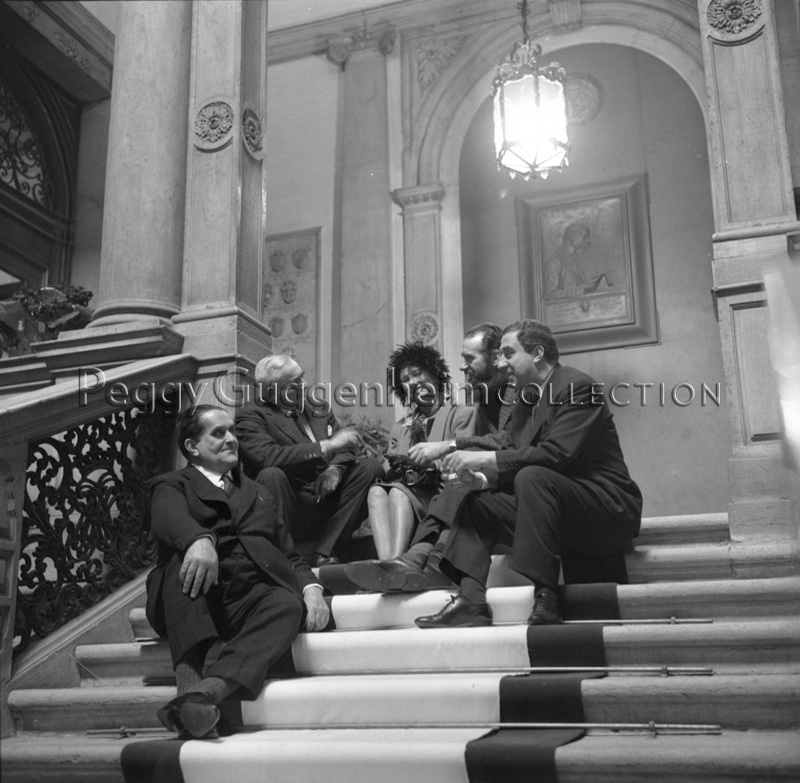 Giuseppe Marchiori, Giovanni Comisso, Peggy Guggenheim, Emilio Vedova e Giuseppe Santomaso (da sinistra a destra) sullo scalone del Municipio di Venezia il giorno in cui viene conferita a Peggy la cittadinanza onoraria, 5 febbraio 1962.