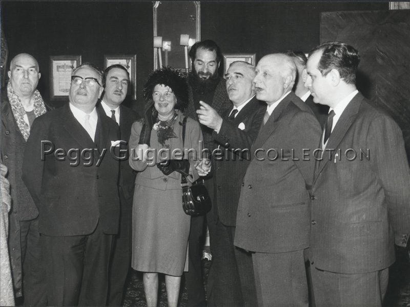 Peggy Guggenheim (al centro) il giorno in cui le viene conferita la cittadinanza onoraria di Venezia, Francesco Scarpabolla, il sindaco della città Giovanni Favaretto Fisca, Giuseppe Santomaso, Emilio Vedova e Giovanni Comisso (da sinistra a destra), Venezia, 5 febbraio 1962.