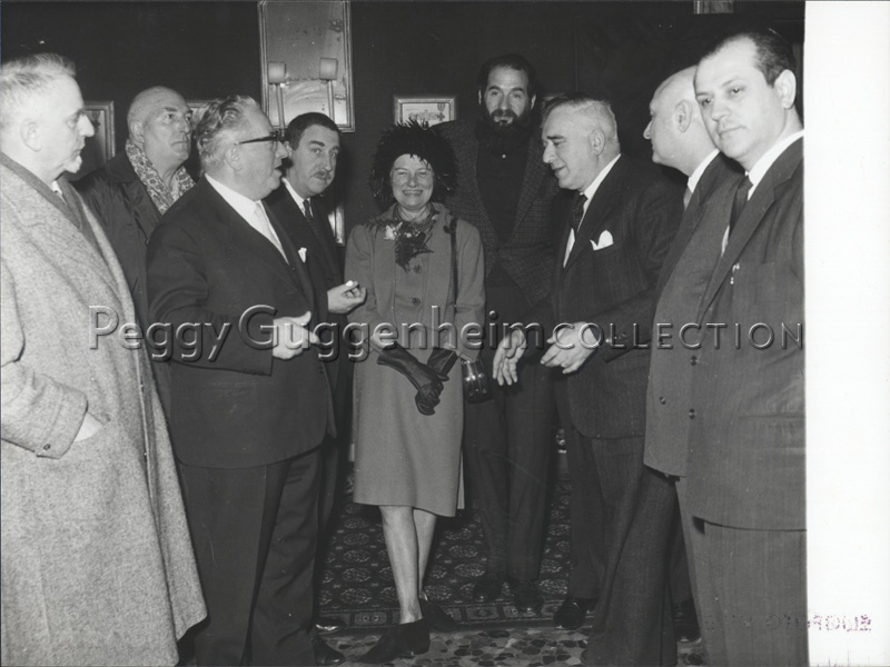 Peggy Guggenheim (al centro) con Francesco Scarpabolla, il sindaco della città Giovanni Favaretto Fisca, Giuseppe Santomaso, Emilio Vedova e Giovanni Comisso (da sinistra a destra), il giorno in cui le viene conferita la cittadinanza onoraria di Venezia, 5 febbraio 1962.