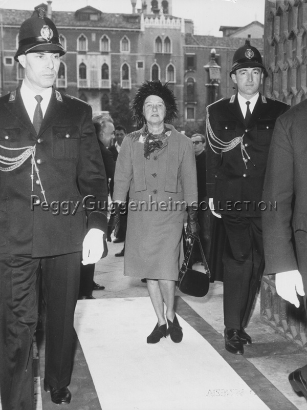 Peggy Guggenheim mentre si reca in Municipio di Venezia, accompagnata da due uomini in divisa, il giorno in cui le viene conferita la cittadinanza onoraria, 5 febbraio 1962.