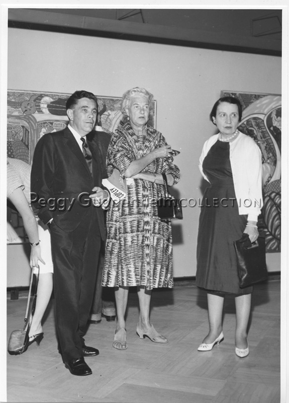 Peggy Guggenheim (center) and artist William Copley (to her left) at Copley's solo-exhibition at the Galleria del Cavallino, Venice, 1960.