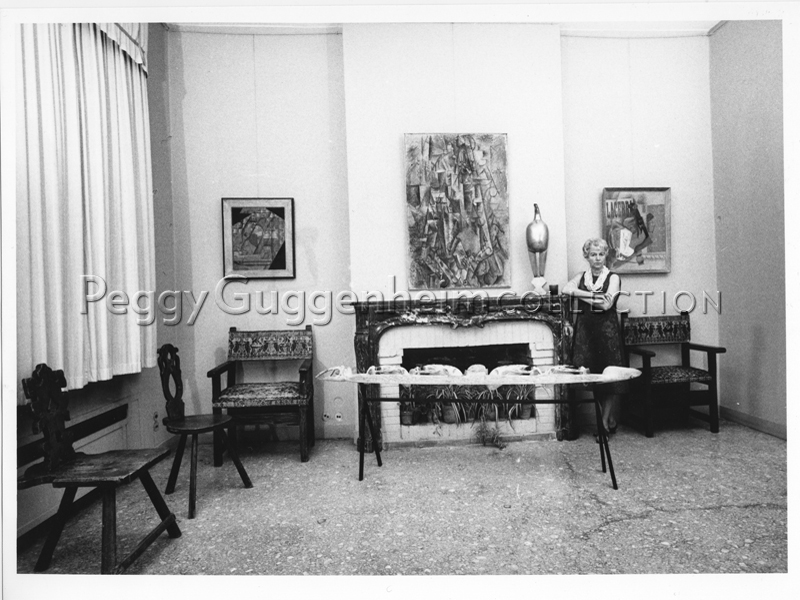Peggy Guggenheim a Palazzo Venier dei Leoni; alle sue spalle (da sinistra a destra) Juan Gris, "Bottiglia di rum e giornale" (1914, PGC), Pablo Picasso, "Il poeta" (1911, PGC), Constantin Brancusi, "Maiastra" (1912, PGC), Pablo Picasso, "Pipa, bicchiere, bottiglia di Vieux Marc" (1914, PGC); Venezia, 1962.