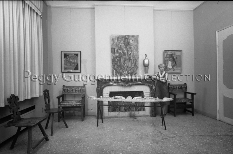Peggy Guggenheim a Palazzo Venier dei Leoni; alle sue spalle (da sinistra a destra) Juan Gris, "Bottiglia di rum e giornale" (1914, PGC), Pablo Picasso, "Il poeta" (1911, PGC), Constantin Brancusi, "Maiastra" (1912, PGC), Pablo Picasso, "Pipa, bicchiere, bottiglia di Vieux Marc" (1914, PGC); Venezia, 1962.
