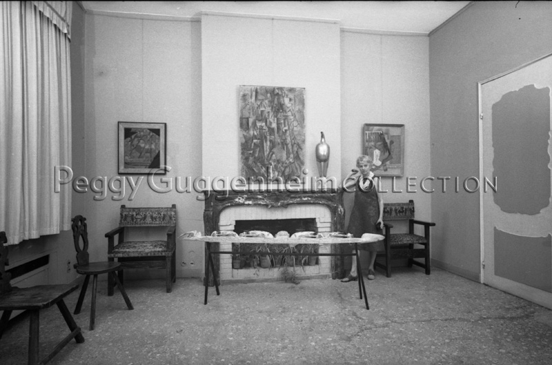 Peggy Guggenheim a Palazzo Venier dei Leoni; alle sue spalle (da sinistra a destra) Juan Gris, "Bottiglia di rum e giornale" (1914, PGC), Pablo Picasso, "Il poeta" (1911, PGC), Constantin Brancusi, "Maiastra" (1912, PGC), Pablo Picasso, "Pipa, bicchiere, bottiglia di Vieux Marc" (1914, PGC); Venezia, 1962.