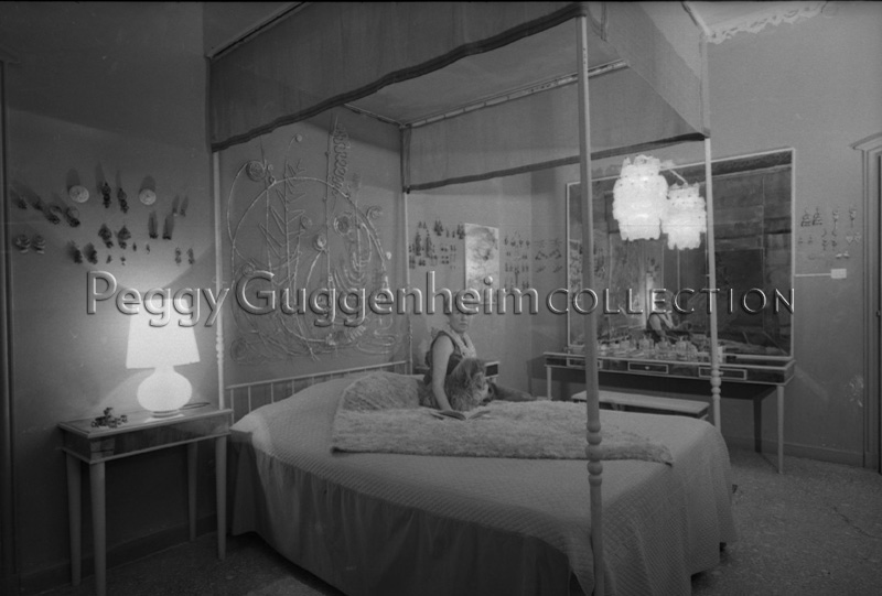 Peggy Guggenheim in her bedroom at Palazzo Venier dei Leoni; behind her Alexander Calder, "Silver Bedhead" (1945-46, PGC); Venice, 1962