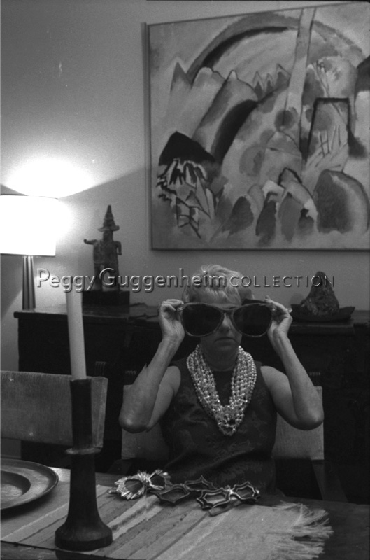 Peggy Guggenheim in the dining room of Palazzo Venier dei Leoni with a pair of glasses purpose-designed for her; behind her (left to right) a male figure from her collection of sculptures from the Americas, Vasily Kandinsky, "Landscape with Red Spots, No. 2" (1913, PGC), Claire Falkenstein, "Doge's Crown" (unknown date and location); Venice, 1962