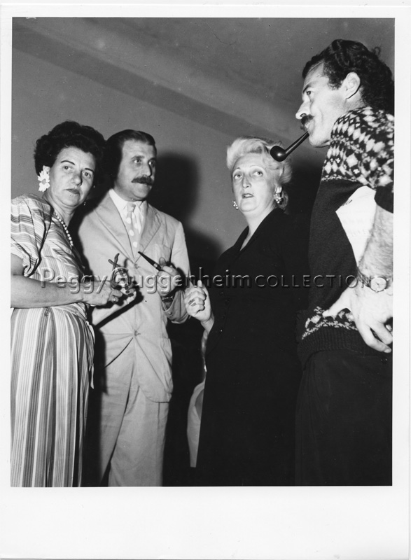 Peggy Guggenheim, il gallerista Carlo Cardazzo, l'arredatrice Fede Cheti, l'artista Angelo Brotto (da sinistra a destra), all'inaugurazione della personale di Buffie Johnson alla Galleria del Cavallino, Venezia, 16 agosto 1948.